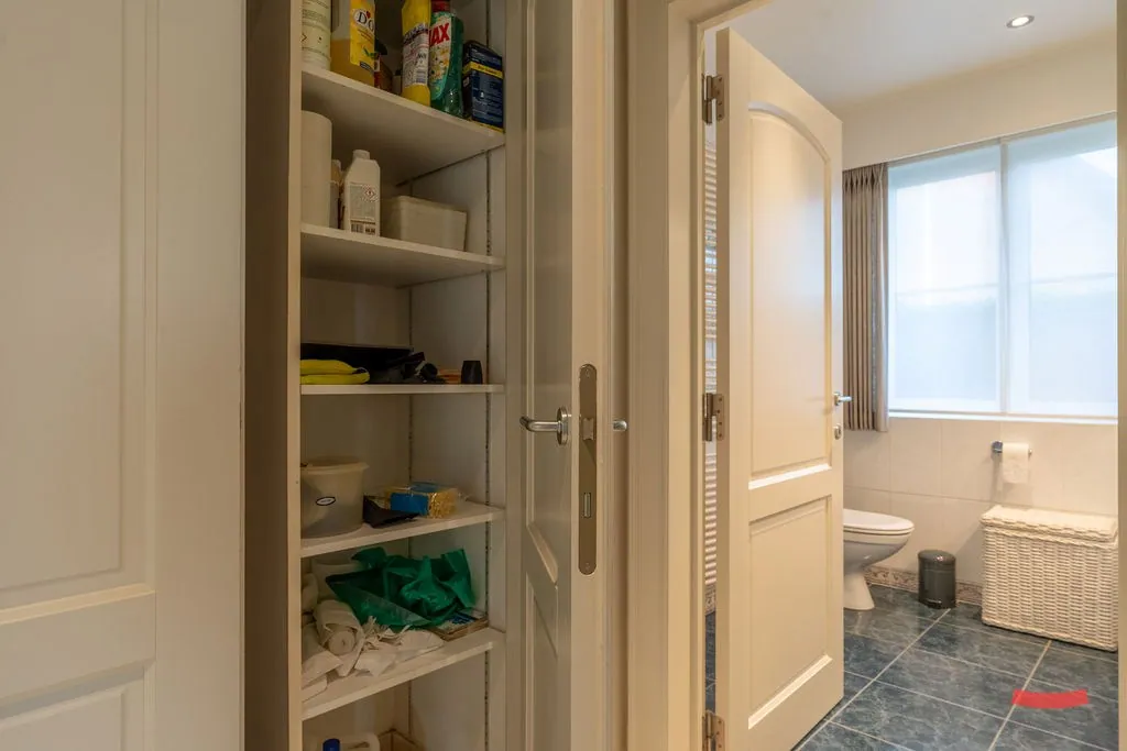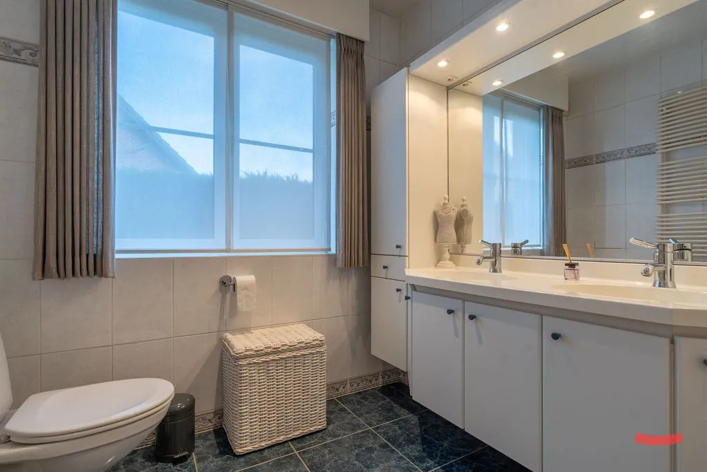 Verder vinden we beneden nog een grote slaapkamer (met kastenwand), met de badkamer ernaast. Deze is voorzien van een dubbele wastafel met kastenwand, douche en toilet.