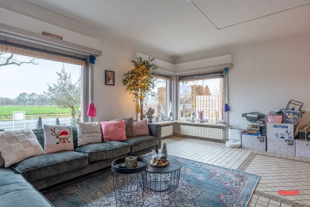 Via de inkomhal komen we bij de L-vormige woonkamer. Verrassend veel lichtinval, toch? Is de vloer iets te veel van ’t goeie? Denk er even een trendy parketvloer bij, en het ziet er plots heel wat hipper uit. Of zie je het meteen wat grootser? Wat dacht je van het slopen van de muur naar de keuken, waardoor je vanuit je woonkamer zo de achterliggende velden in kan kijken?