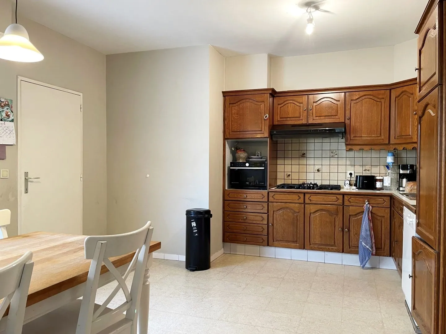 Ook de woonkamer is een fijn formaat. Niet té groot, maar warm en gezellig. Aansluitend werd later een veranda aangebouwd. Van zodra het zonnetje schijnt in ’t voorjaar, kan je de dubbele deuren open gooien en haal je de zon zo de woonkamer in. Ook de keuken is nog een gouwe ouwe: een tikje klassiek misschien, maar ga al eens met een verfborstel aan de ... slag, en het ziet er plots al helemaal anders uit. Verder is het echt familiekeuken, want er is meer dan voldoende ruimte om ’s ochtends met het hele gezin te tafelen. Naast de keuken is trouwens nog een grote kelder, dus ideaal voor de voorraad.