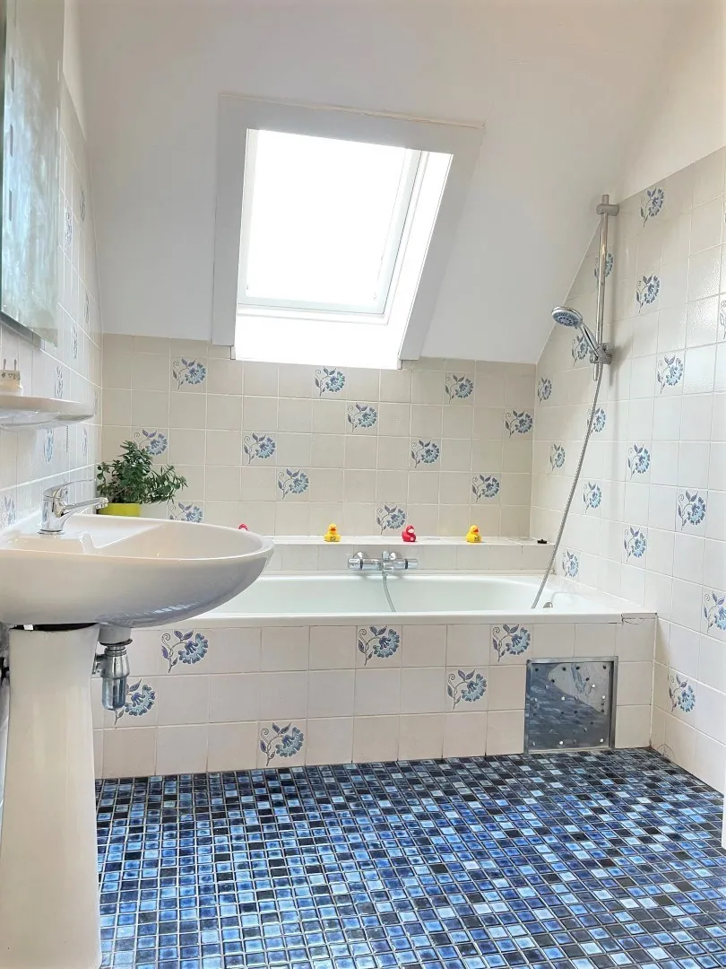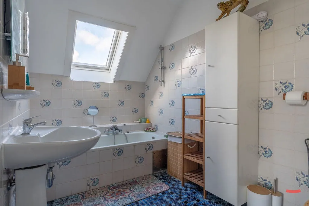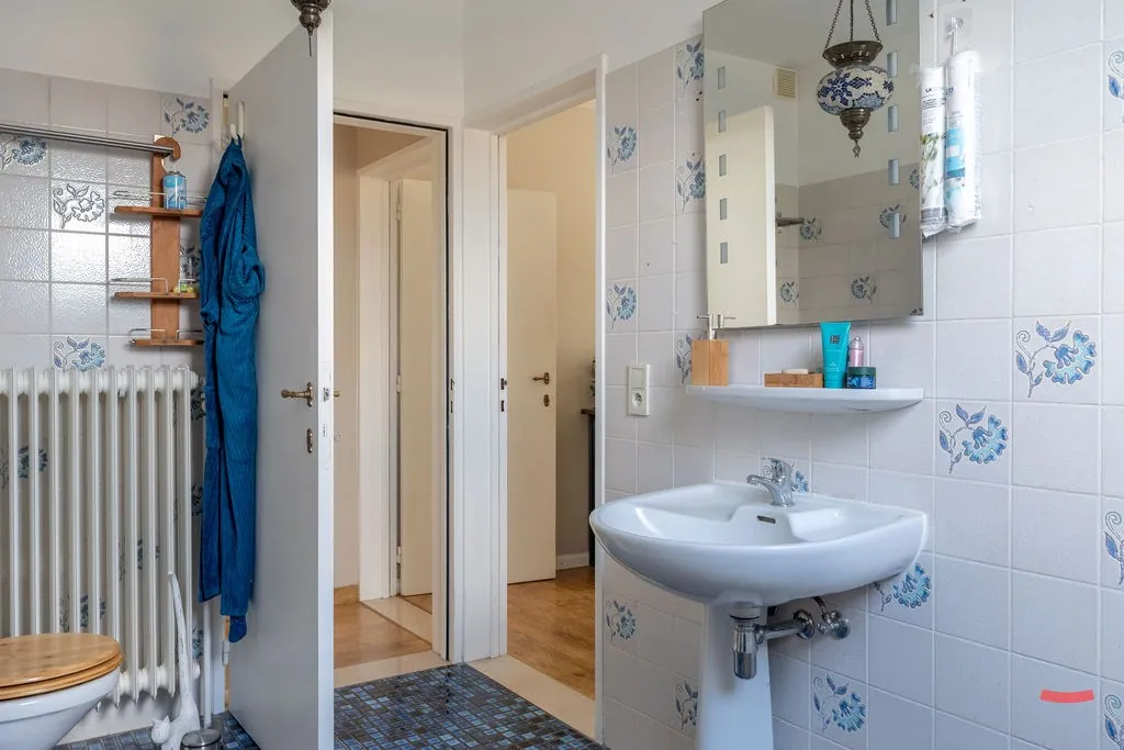 Boven zijn 3 slaapkamers, waarvan 2 voorzien werden van een kastenwand. Verder zijn er nog extra kasten in de gang, dus die rommeltjes krijg je wel kwijt. En tenslotte hebben we nog de badkamer. Oké, die is blauw. Niet iedereen z’n ding, dat snappen we best. Maar past prima in ’t plaatje, toch? Hier is een bad, wastafel en toilet. By the way: de badkamer is toegankelijk via de grote slaapkamer, maar ook via de hal.